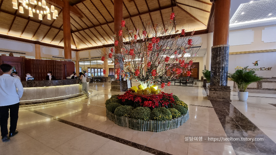 로비에 들어서자마자 감탄이 절로 나왔어요. 높은 천장, 화려한 조명, 고급 원목 인테리어가 ‘여기 진짜 고급 리조트구나’ 싶었고, 설 연휴를 앞두고 베트남식 설 장식(복숭아꽃, 금색 호박)도 멋지게 꾸며져 있어 눈도 마음도 즐거웠습니다.