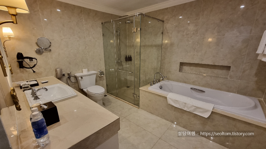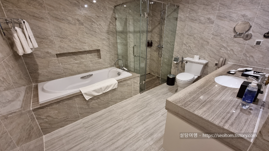 고급 대리석 마감에 샤워부스 + 욕조가 분리된 구조에 어메니티도 잘 갖춰져 있었고, 수건도 넉넉하게 비치돼 있습니다. 이렇게 큰 사이즈의 욕실에 있는면, 나중에 집을 짓는다면 무조건 큰 욕실을 만들어야겠다는 생각이 들죠.