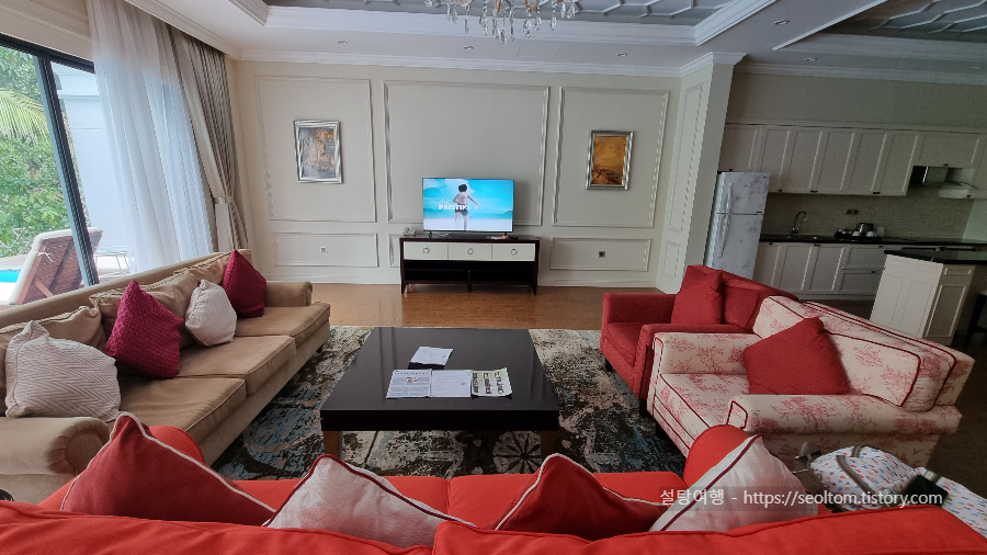 우리가 숙박한 호텔은 2베드룸의 풀빌라 입니다. 2개의 방, 주방, 거실, 3개의 화장실 그리고 3식이 포함입니다.