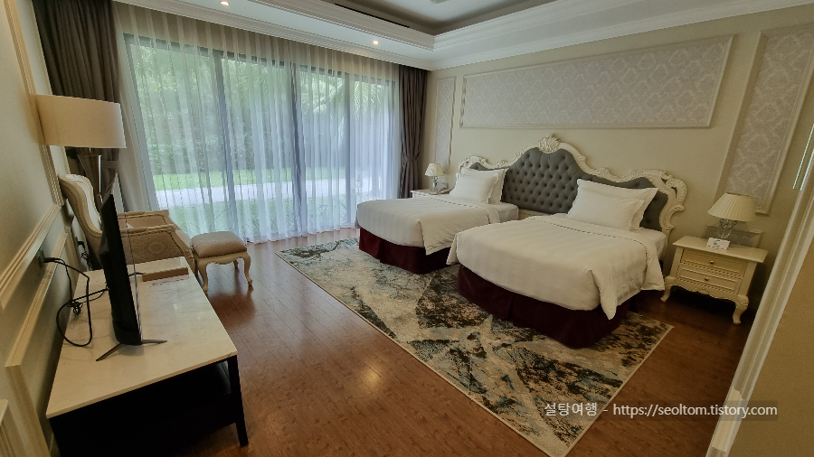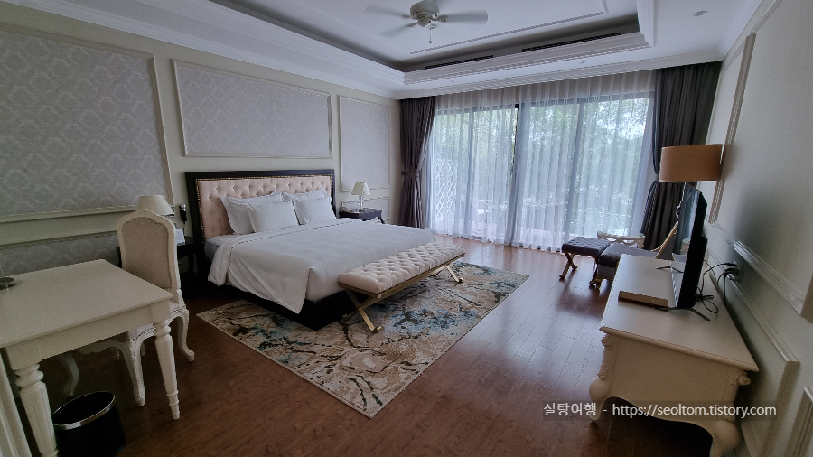 킹사이즈 침대, 화장대, TV, 테라스 뷰까지 완벽합니다. 커튼을 열면 바로 열대 나무 숲과 풀에 바로 접근이 가능합니다. 특히 큼직한 침대는 3명이 잘 수 있을 정도의 빅사이즈 였어요. ㅎㅎ