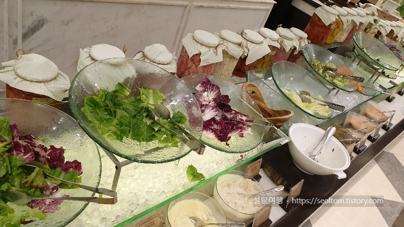 다채로운 채소와 드레싱이 준비된 샐러드 바. 직접 담근 피클까지 곁들여 건강한 한 접시를 완성할 수 있었습니다.