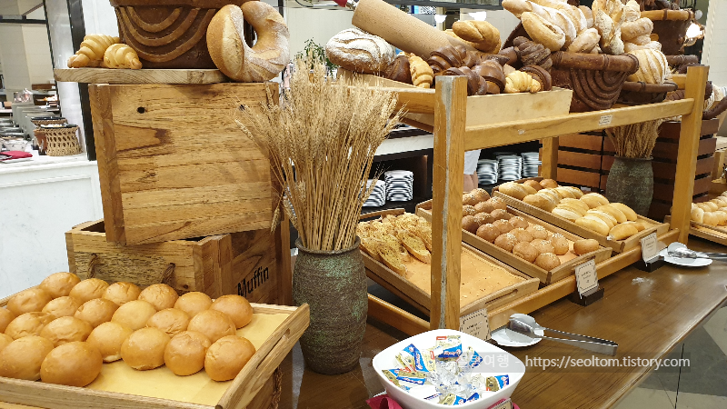 다양한 종류의 빵이 풍성하게 준비된 베이커리 코너. 갓 구운 버터롤과 바게트를 신선한 잼과 함께 즐기는 아침은 최고의 시작이었습니다.