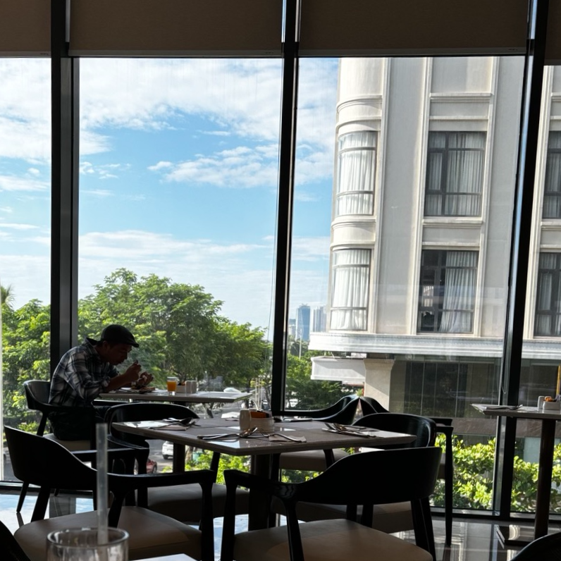 다낭에 오면 한국과 시차가 2시간 정도라 매일 아침 5시만 되면 자동으로 눈이 떠 집니다. 어웨이큰 호텔에 숙박을 한날도 엄청 일찍 일어나 호텔에서는 보이는 일출을 맞이하고 7시가 조금 넘어 식사를 하러 갔습니다. 웬걸 식당에 사람들이 가득차 자리가 없을 정도 였습니다.