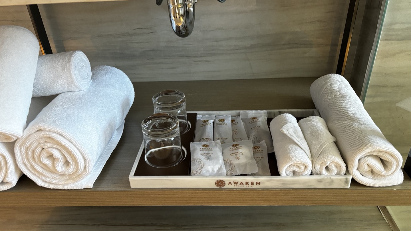 화장실에 비치되어 있는 기본 어메니티 입니다. 아주 고급스럽지는 않지만, 면도기, 치솔 같은 기본적인 일회용품을 제공하고 있습니다. 화장실 역시 신상 호텔 답게 아주아주 깨끗했습니다.