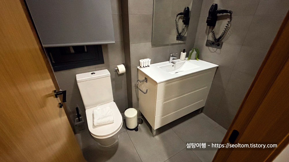 현대적인 욕실은 넓고 깨끗하며, 샤워 시설과 함께 어메니티가 제공됩니다. 욕실의 단점은 문이 변기 쪽으로 달려 있어서 뭔가 불편했고 건식 샤워실은 물이 밖으로 많이 튀어서 샤워 후에 쾌적함이 조금 부족했습니다.