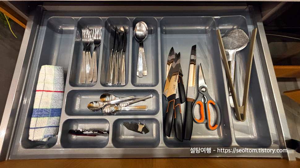 포크, 나이프, 숫가락, 스푼, 와인 따게, 가위, 칼, 브레드 칼, 집게 등 조리에 필요한 대부분의 식기구가 있습니다. 단 젓가락 없으니, 준비해가시기 바랍니다.