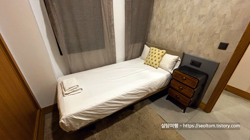 아쉽지만 두번째 침실은 작은 싱글 침대로 되어 있었습니다. 두명이 자기는 힘들고 베게도 조금 부족하네요. 이 방도 마찬가지로 붙박이장이 설치되어 있어 짐을 두기에는 나쁘지 않았습니다