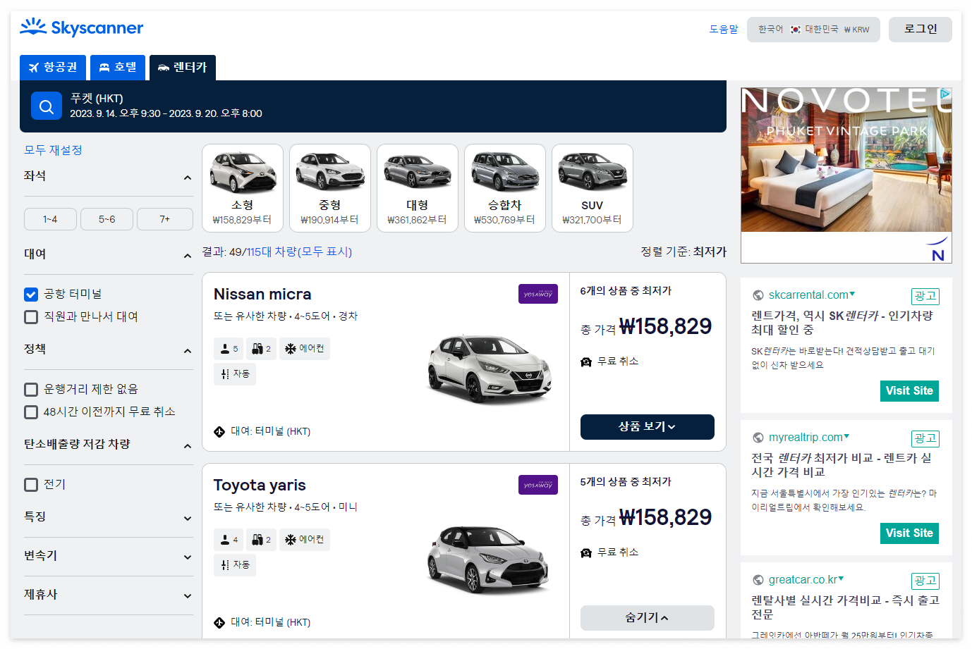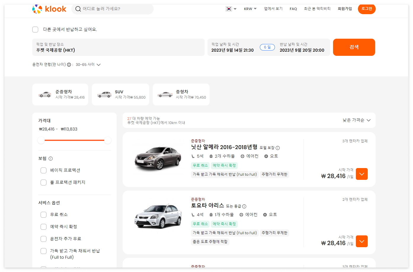 일단 푸켓에 렌트카를 예약하기 위해 클룩, 스카이스캐너에서 먼저 검색을 해보았습니다.