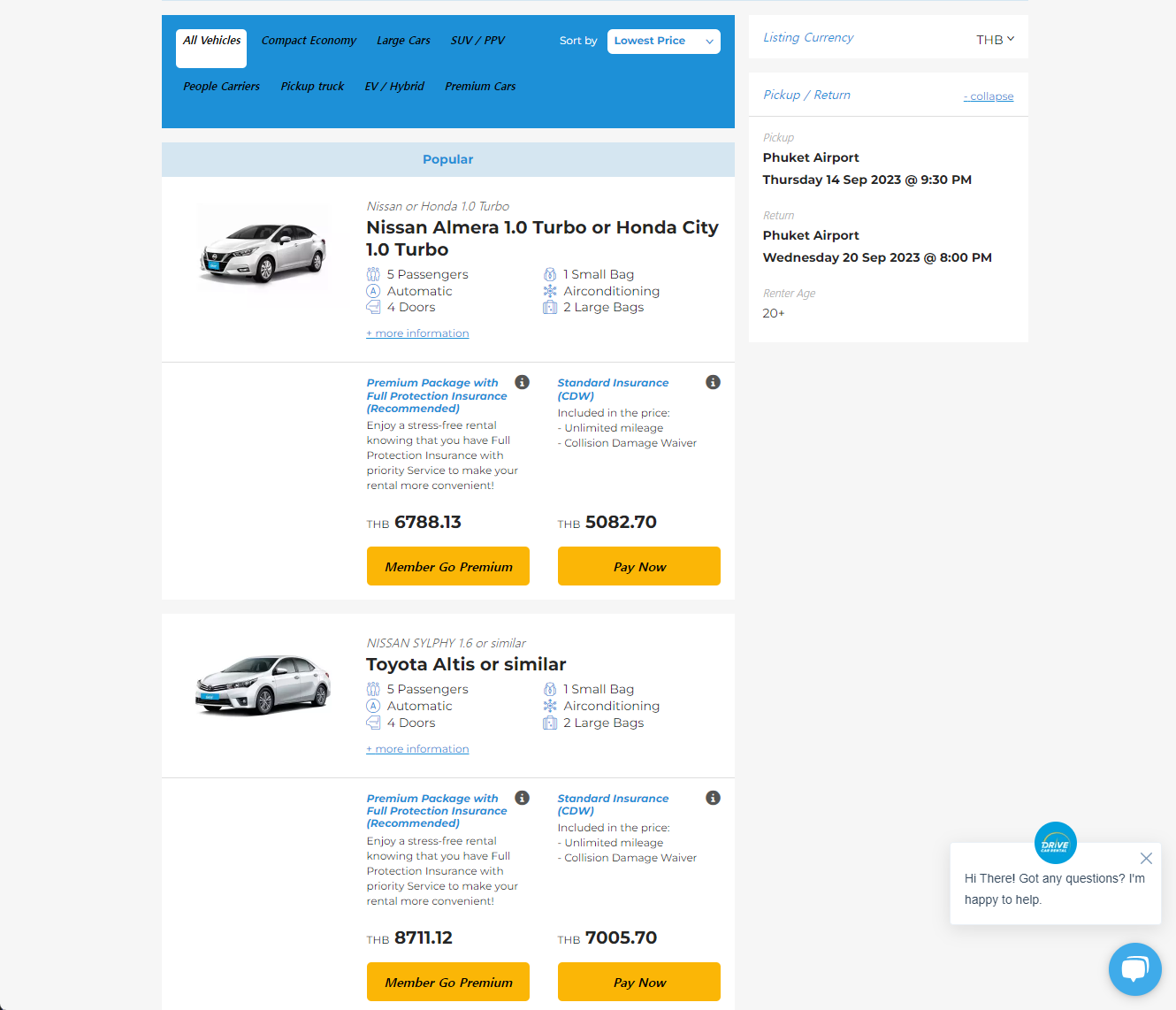 다음은 해당 상품을 제공하는 www.drivecarrental.com 에서 검색한 렌탈 비용입니다. 닛산 알티마는 6788바트, 토요타 Altis 는 8711 바트로 예약이 가능하네요. 가격은 클룩이나 스카이스캐너에 비해 조금 비싸지만, 아주 강력한 보험을 제공해서 마음에 듭니다.